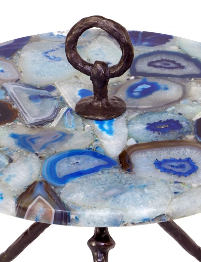 A hand sculpted and forged tripod cocktail table with a circular glass top, it is fastened with a solid bronze handle on top.
