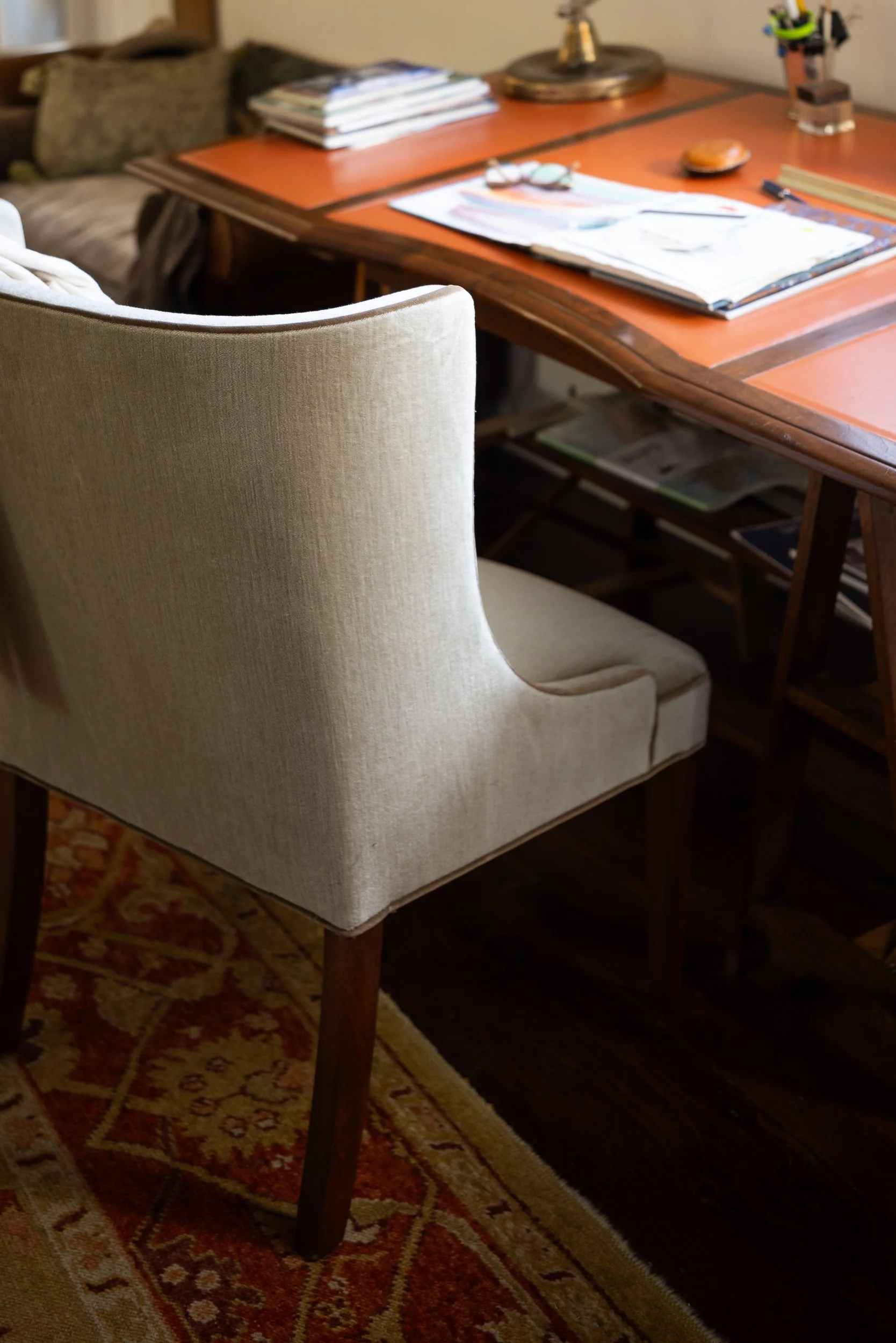 The upholstered chair with a concave tufted back and tapered legs is hand-crafted, frame in alder wood.