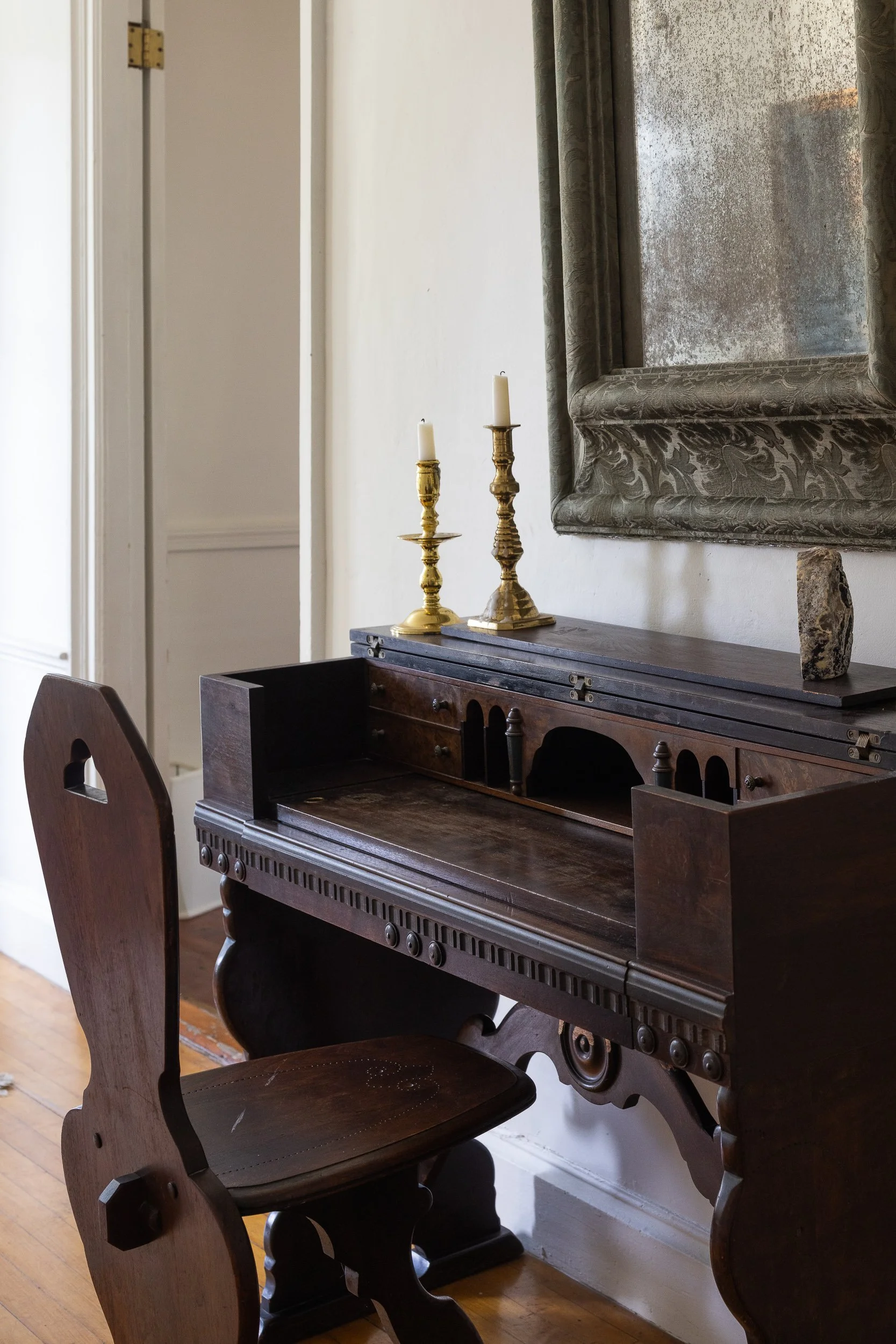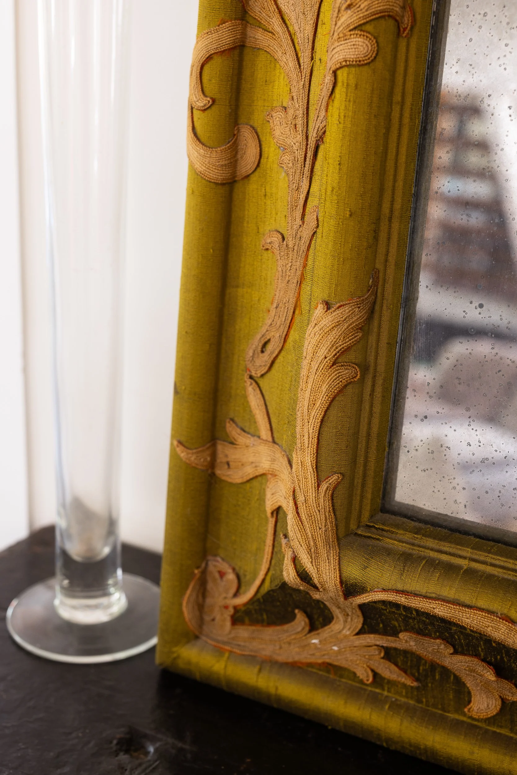 A hand-crafted wood mirror with mitered corners and traditional joinery, completely wrapped in fabric, with antiqued silver-leaf mirror.