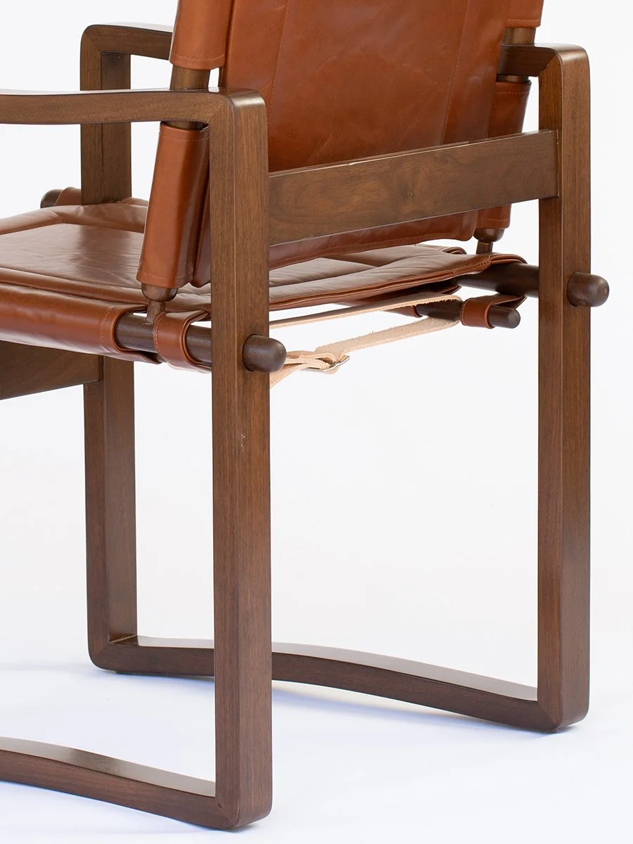 A reference to Danish furniture design from the 1960s with its simple and gracefully curved frame. Upholstered with a sling seat affixed with sturdy leather straps, the chair is meticulously constructed with traditional joinery.