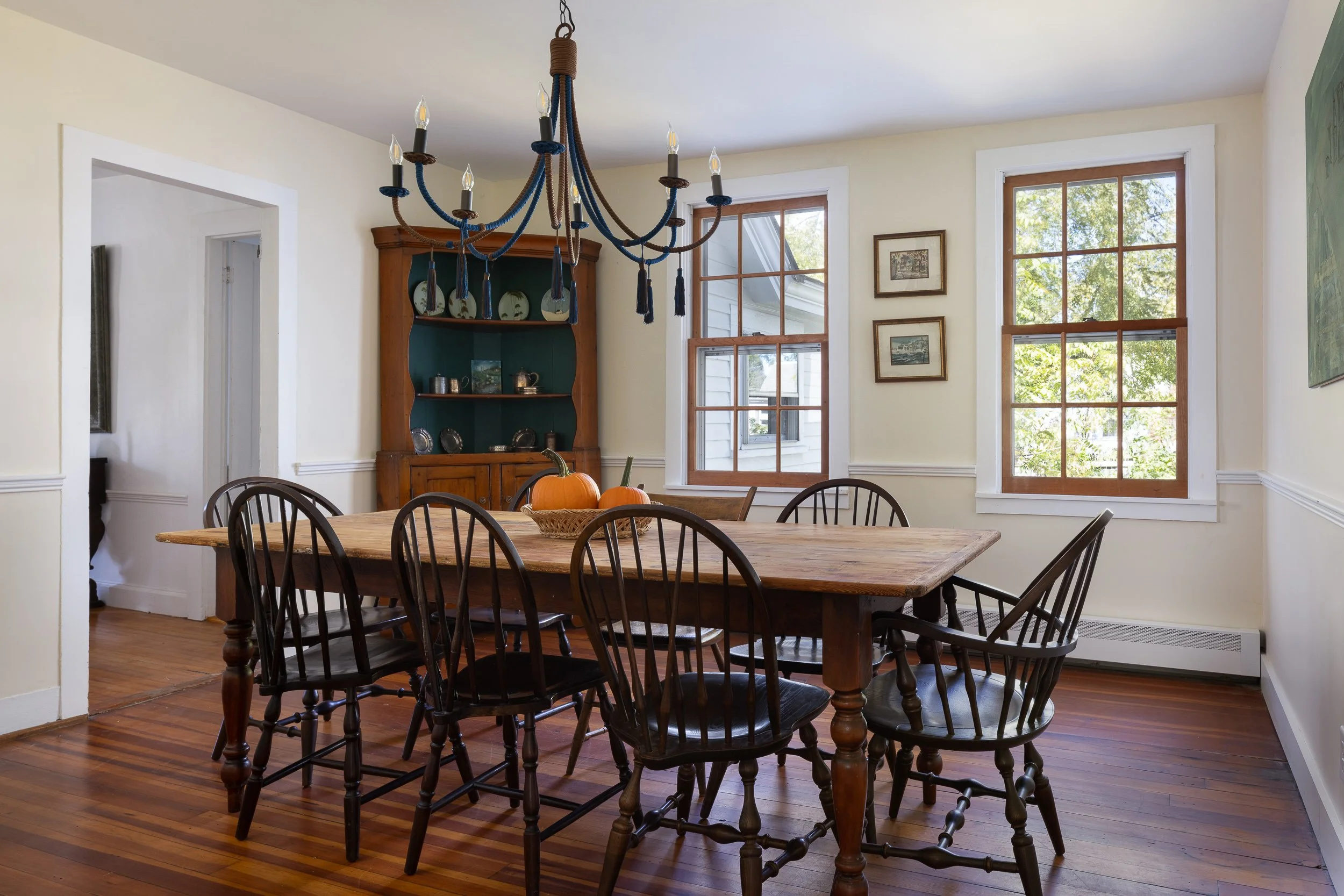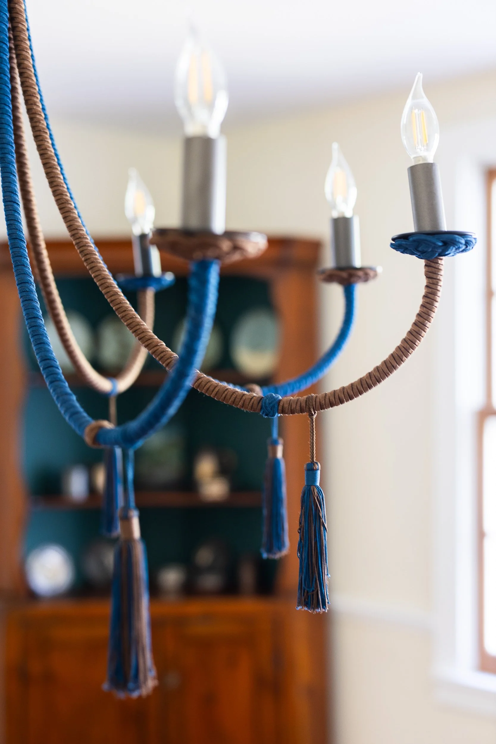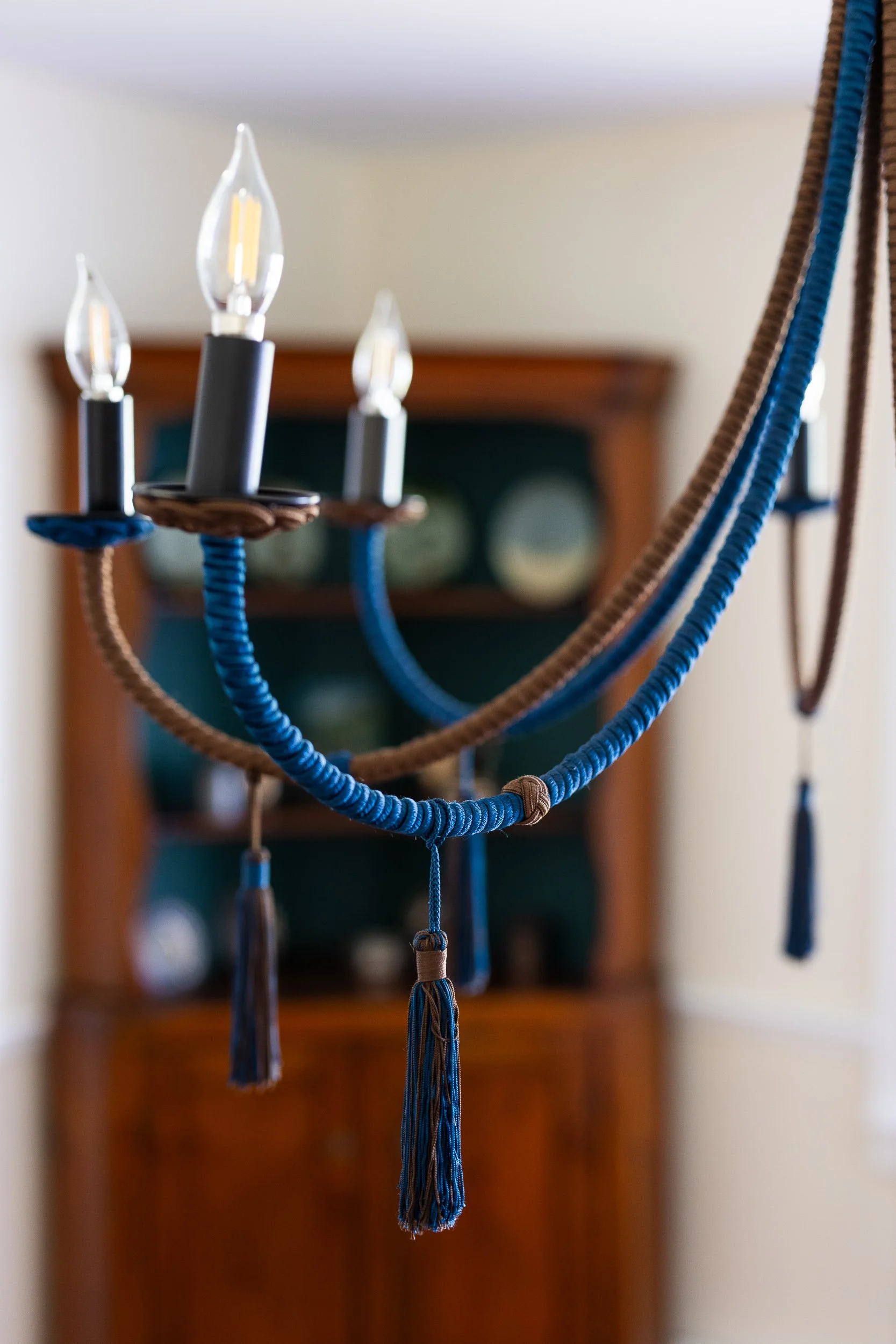 Wrought iron structure is wrapped with silk cording. All eight arms extend uniformly from the center, alternating in colors. Cording under the bobèche is shaped in traditional passementerie knotted detail.